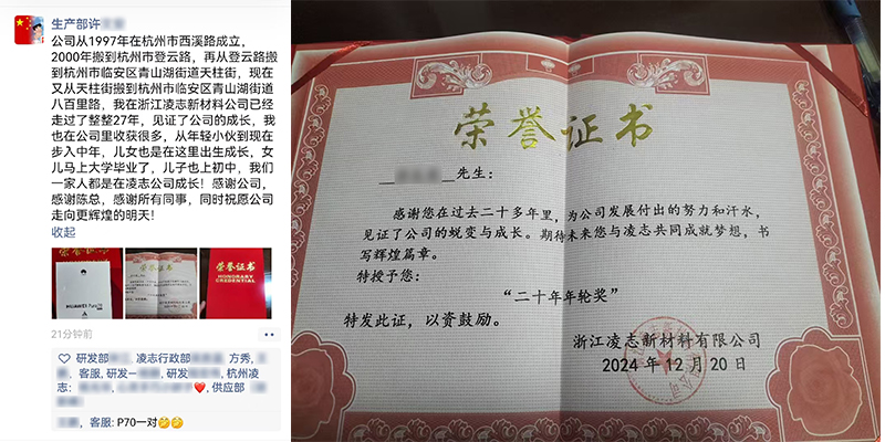 为了感谢陪伴公司一路成长的老员工们,公司领导特意为工龄达到20年及以上的员工颁发了“二十年年轮奖”。每位获奖者不仅收到了一份yd2333云顶电子游戏的荣誉证书,还获赠了一台华为p70手机,以表谢意。领到手机的员工们纷纷表达了对公司的感激之情,喜悦之情溢于言表。这一奖项不仅是对他们辛勤付出的认可,更是公司对老员工们无私奉献的最高敬意。其中获奖的许先生还特意在朋友圈中发表了自己对公司深深的感谢之情,让大家为之动容,并为他感到高兴。